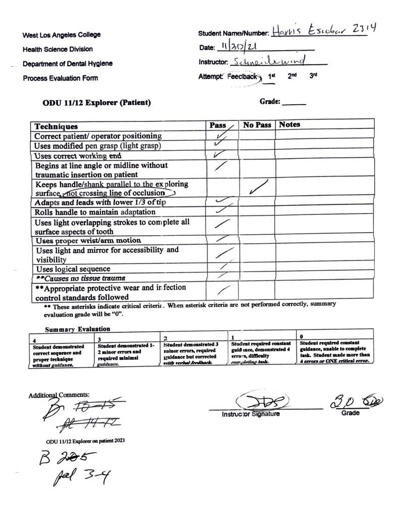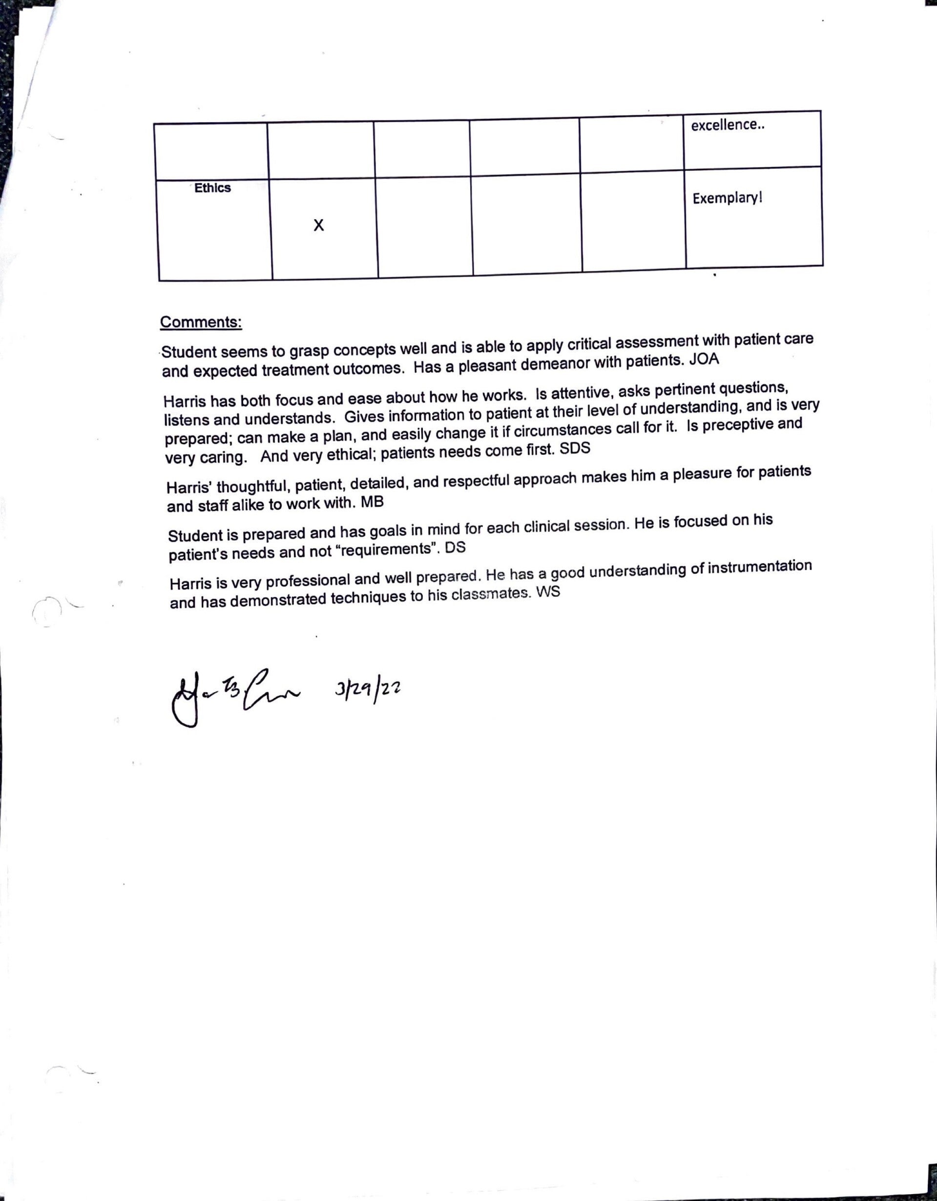 These are some of my evaluation forms showing my clinical performance, from taking vital signs to instrumentation on dental typodonts and moving up to student patients and on patients who I brought to clinic. These range from my first semester in Junior year to Spring 2022 semester.