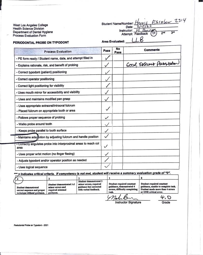 - This was one of the same evaluations from the previous semester for probing on typodont. In the previous process evaluation I received a 3 out of 4, which is still a pass but in this level we are expected to have really perfected our skills. In this evaluation I received a 4 and some positive commentary on my performance.