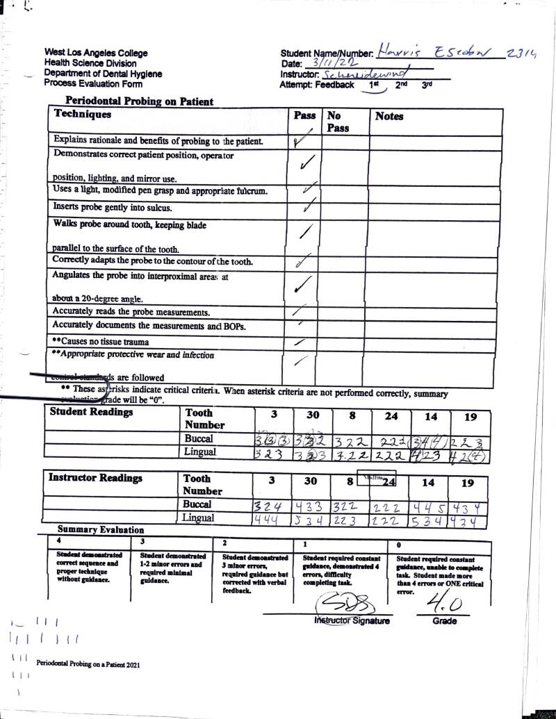 - This was an evaluation for actual periodontal probing on a patient in which I was able to use my skills I learned on my typodont in real life situation. I did receive a 4 out of 4 for this evaluation following the previous guidance from my professor(s).