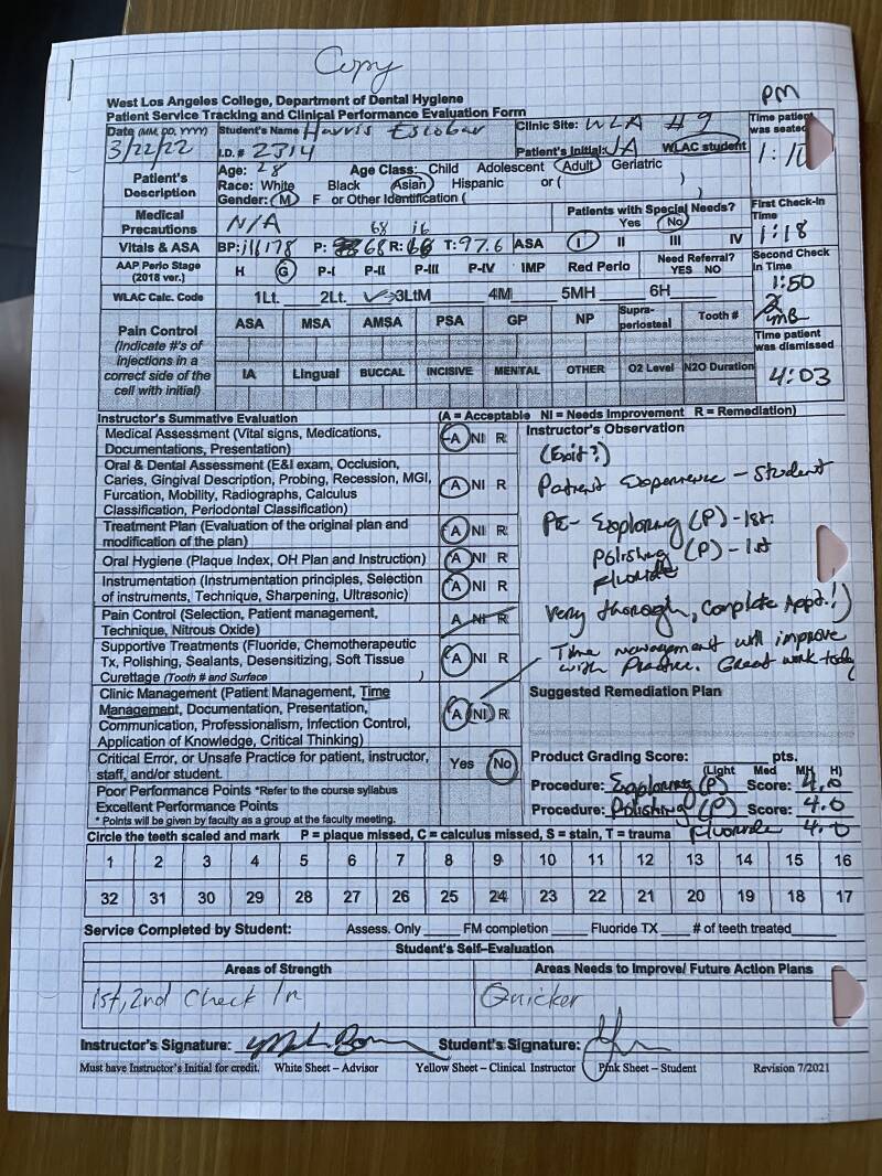 - NCR from Spring 2022 Semester demonstrating student patient experience. In order to complete this process evaluation we have to complete a full appointment on a fellow student.