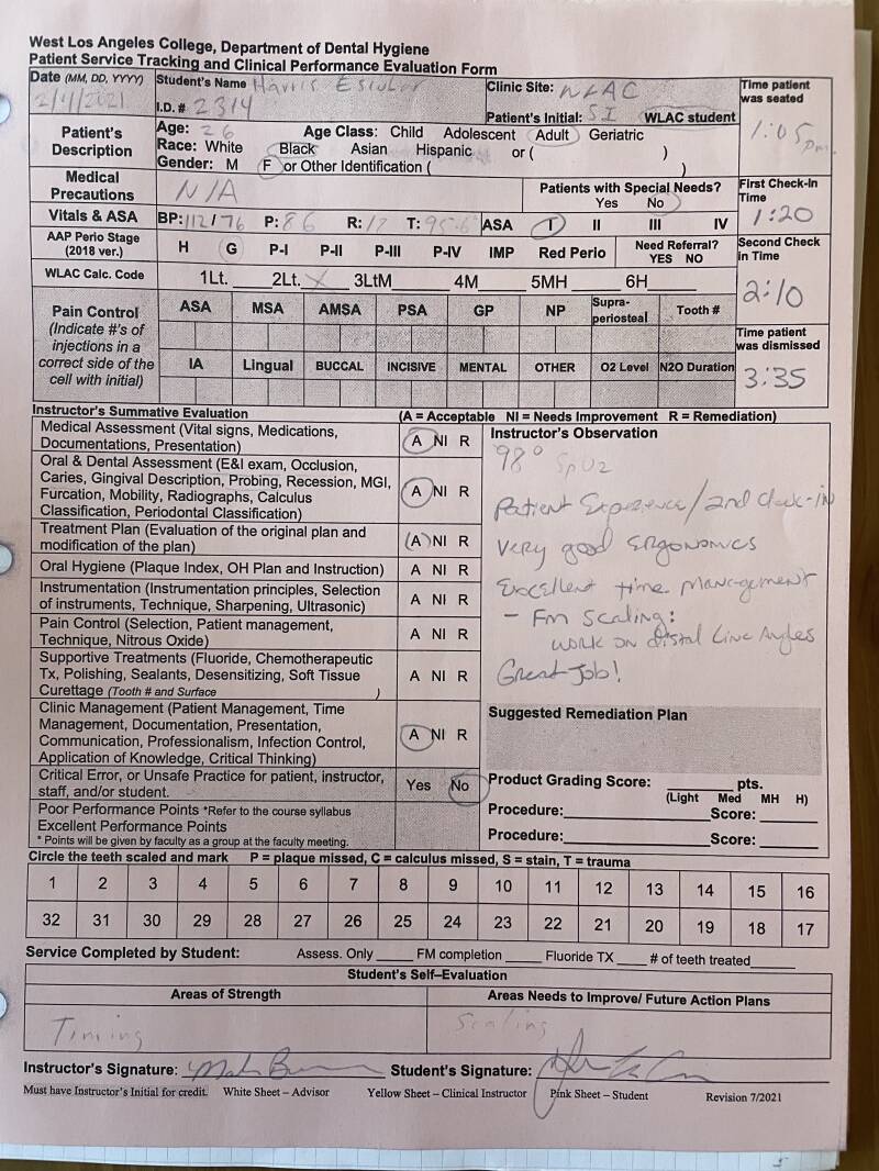 - This is one of my first complete appointments on a fellow student in the Winter 2022 semester 2/4/2022. I was able to scale the full mouth within the time given. The patient was ASA I with no medications or precautions, E/O I/O WNL, Angles Class I all around.